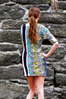 Contains: Rayon/cotton blend printed knit with striped detailing down the right side.