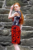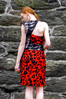 Contains: Red leopard print cotton blend cocktail dress with accented neckline and sleeve.